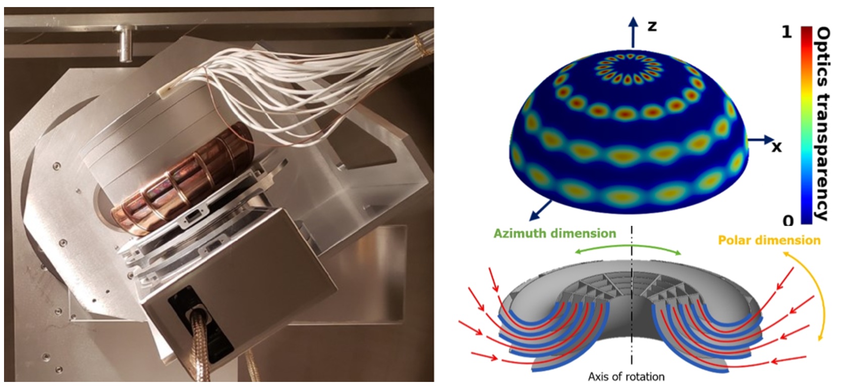 Left: instrument undergoing testing in the LPP cleanroom. Bottom right: charged particles (shown in red) arriving from all directions. Top right: Instantaneous hemispherical field of view of the miniaturized plasma camera.