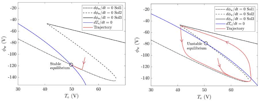 Fig. 2: Example of stable equilibrium (left) for a low value of E0, the exciting electric field, and unstable equilibrium (right) for a higher value of E0 The theory predicts the range of electric fields for which relaxation oscillations are observed.