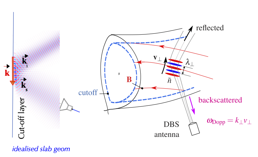 Grâce à sa capacité à caractériser simultanément écoulements et fluctuations résolues en k, le DBS est un diagnostic très riche en informations pour l’étude des interactions turbulence-flots : vitesse de dérive ExB (ou champ électrique radial) d’équilibre et oscillant ; structure spatiale de la turbulence à petite et grande échelle, par le spectre en nombre d’onde et la longueur de corrélation radiale des fluctuations ; identification du régime turbulent, par l’asymétrie et l’inclinaison moyenne des structures turbulentes ; effets non locaux ; développement des filaments et bouffées intermittentes au bord du plasma.